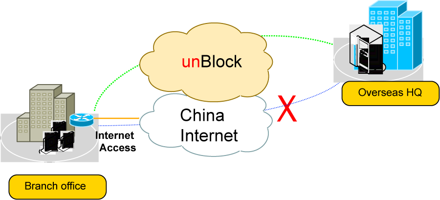 Client company in line with the existing line or new applications on the Internet, the frame set Router Cisco, built a dedicated encryption channel connected to the unBlock domestic computer room, access to unBlock backbone network.